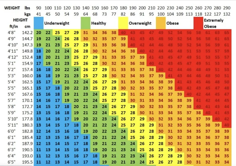 Please note, due to our insurance our maximum weight is 270 lbs and we must follow a BMI chart. We are unable to take riders whom fall in the red (table below)
